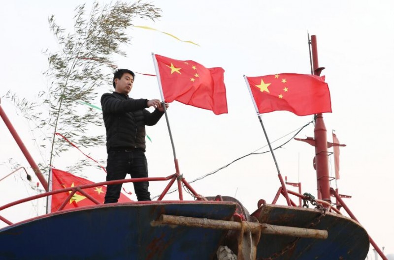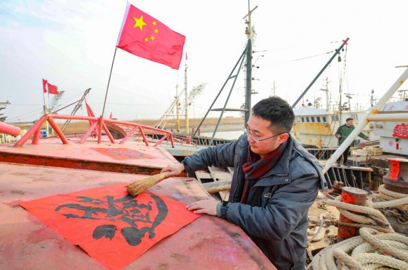 当日是农历大年二十九,江苏省连云港市赣榆区沿海渔民在渔船上挂国旗、贴福字、放鞭炮,祈求来年渔业丰收。
