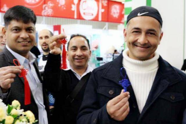国外友人来到特仑苏展馆领取中国结伴手礼