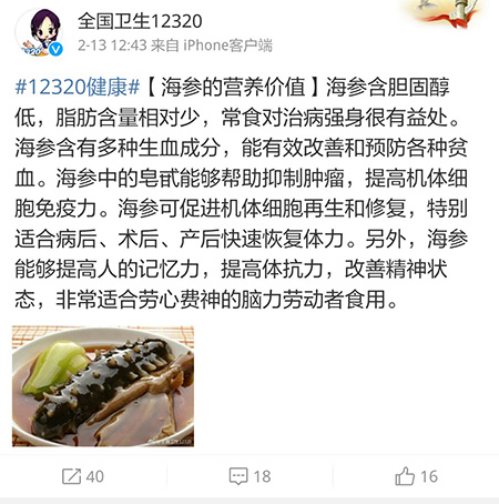 有意思的是,@全国卫生12320不仅怼过阿胶,还捧过海参和干贝。官微曾盛赞干贝是“女性减肥修身之佳品”,“有助于降血压、降胆固醇”,“还具有抗癌、软化血管、防止动脉硬化等功效”。对于海参,@全国卫生12320的官微也不吝表扬,“海参中的皂甙能够帮助抑制肿瘤,提高机体细胞免疫力”。