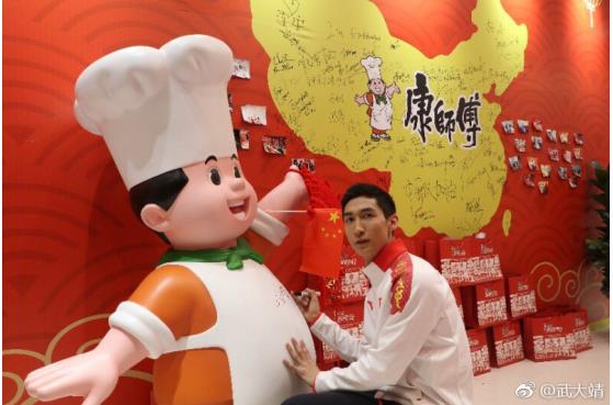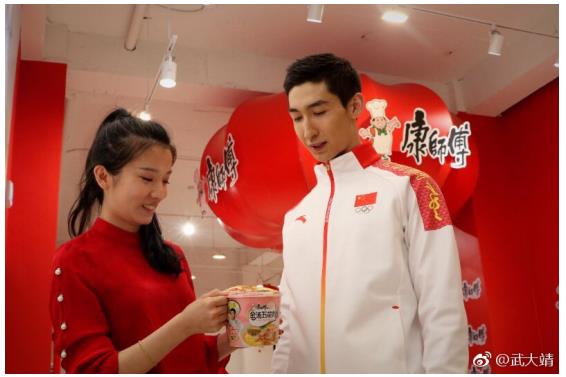 一进门就是中国地图的签名墙,面馆工作人员热情地邀请武大靖签名,他高兴地在他的家乡东北区域和康宝宝的围裙上签下了自己的名字。本已有些疲惫的武大靖来到面馆后变得兴奋起来,面馆里的灯笼、窗花、对联装饰充满了浓浓的年味,就像回到家一样。他和康宝宝以及工作人员一起合影,工作人员递给他一桶康师傅金汤五花肉面,“吃金汤面,拿金牌”,这个美好的寓意让武大靖对这款面爱不释手。