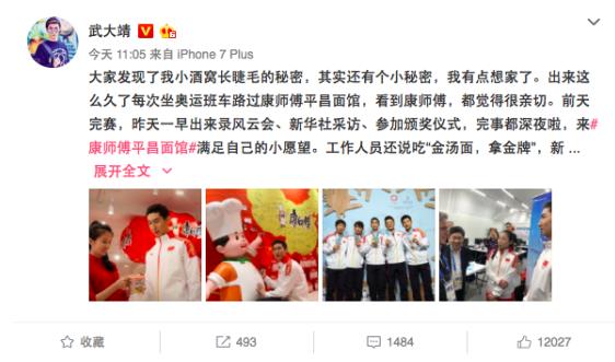 在为中国冬奥代表团斩获平昌冬奥会唯一金牌后,武大靖这几天的安排特别忙。23日深夜,武大靖在忙完一天的工作后,特别来到康师傅平昌面馆满足自己的小愿望。随后发布微博:吃“金汤面,拿金牌,新年讨好彩头。”