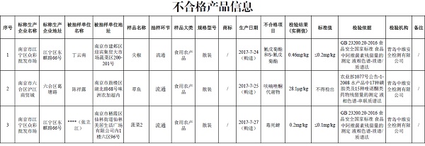 (一)南京市建邺区迎宾集贸大市场蔬菜区200-201号(丁云南)销售的“尖椒”(散装,购进日期为2017-07-24),氰戊菊酯和S-氰戊菊酯检测值为0.46mg/kg,标准值为≤0.2mg/kg。检测机构为青岛中维安全检测有限公司。