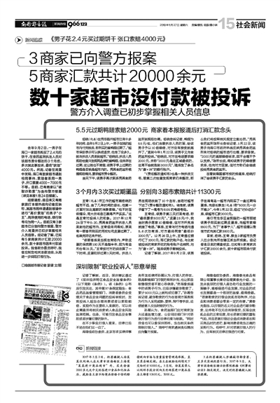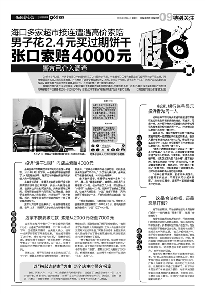 2017年9月2日,一男子在海口一超市花2.4元买到过期饼干,在执法人员对该超市责令整改的3个月后,该男子多次就此事投诉,最终“获赔”4000元。经记者调查发现,海口有数家超市均遇到相同事件,索赔者系同一男子,索赔4000~7000元不等。目前已有5商家共汇款2万余元,数十家超市因未付款遭投诉。(详见本报1月24日、27日相关报道)
