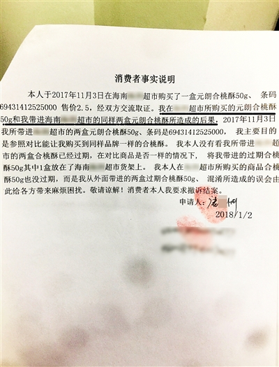 金盘食药监所向记者提供了这份《消费事实说明》,该份《说明》中写道:“我所带进超市的两盒50g元朗合桃酥,主要目的是参照对比能让我购买到同样品牌一样的合桃酥。我没有看所带进超市的两盒合桃酥已经过期,在对比商品是否一样的情况下,将带进的过期合桃酥其中1盒放在了超市货架上。我本人在超市所购买的商品合桃酥也没过期,而是我从外面带进的两盒过期合桃酥、混淆所造成的误会,我本人要求撤诉结案……”