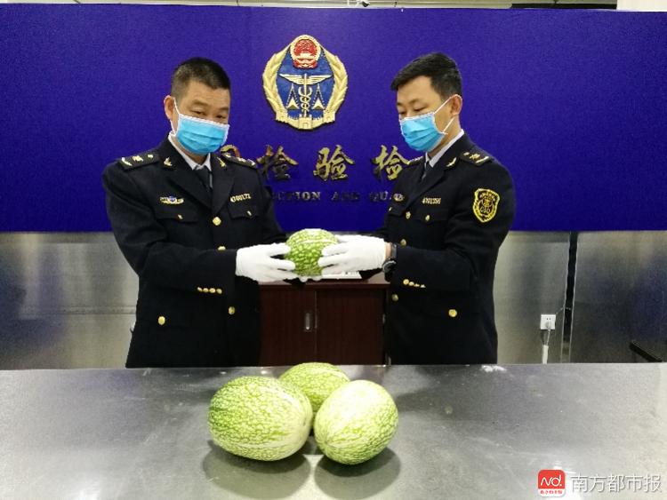 2月22日,深圳皇岗检验检疫局工作人员在福田口岸从一名入境旅客携带的行李中查获4个瓜果,重量共计6公斤。经检验检疫工作人员初步鉴定,该批瓜果疑似为“鱼翅瓜”。据悉,“鱼翅瓜”又称金丝瓜,瓜肉内天然形成一束束瓜丝,形似粉丝、鱼翅,因而也被称为“鱼翅瓜”。
