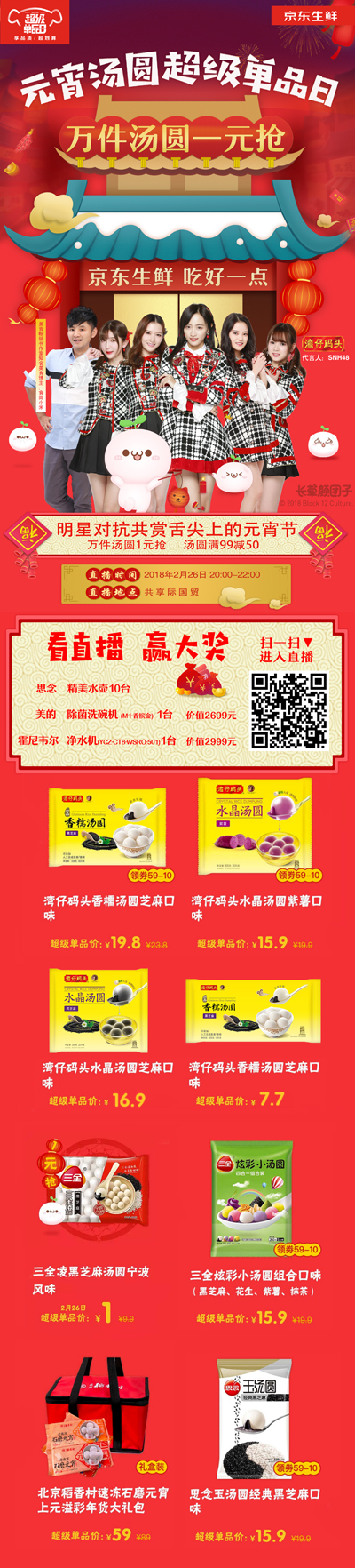然而,爱搞事的京东生鲜并不满足于仅此一萌,于是又“勾搭”了亚洲最大的女子天团——SNH48,青春可爱的美少女们一来京东就亮出了豪迈福利:2月26日20:00-22:00,湾仔码头的代言人、肤白貌美气质佳的小姐姐们将在京东直播,与网友亲密互动并为大家推荐好吃的汤圆。