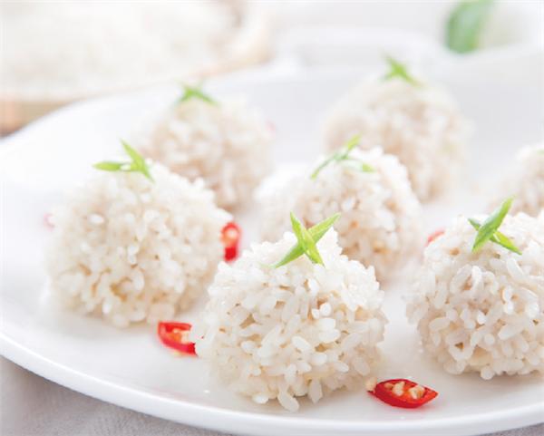 徽菜中的传统蒸点糯米圆子,制作工艺精细,成菜后糯米晶亮如珠,肉圆鲜嫩圆润,更承袭徽系蒸菜食补特性,有补中益气,健脾养胃的作用,是安徽一带春节家宴招待亲友的必备菜肴,吃糯米圆子更是家家户户团团圆圆、美满幸福的象征,正所谓“一颗一颗糯米圆,好运多多福连连”。