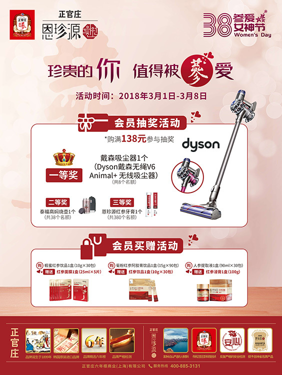 3.8女神节已经越来越近了,如果你还不知道要给女神送上什么礼物?3月1日-3月8日,赶紧亲临正官庄品牌门店,Dyson(戴森)吸尘器、红参面膜、正官庄高丽参……女神的最佳送礼攻略都在这里了!