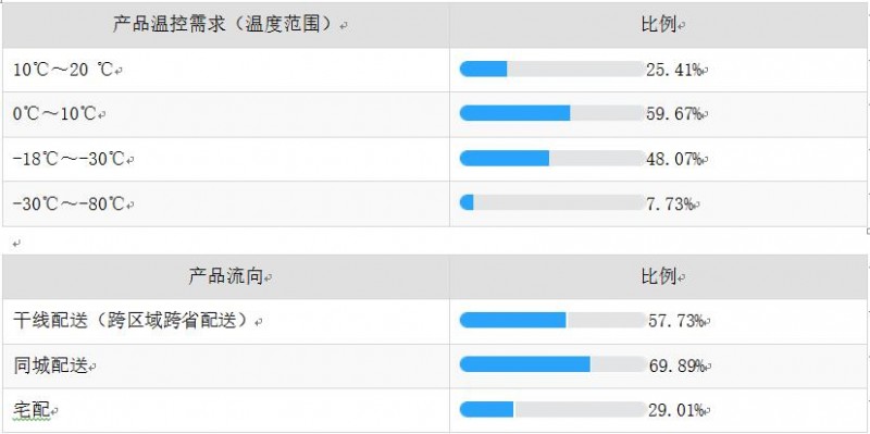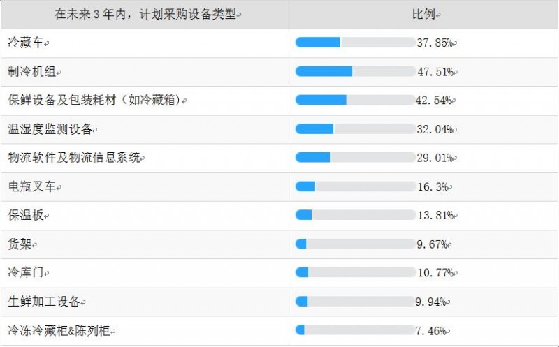 我们也就某些关键设备和产品的需求进行问询,发现关键设备如制冷机组、冷藏车和保险设备及包装耗材依然存在旺盛的采购需求。温控监测设备和技术的应用也越来越被大家重视,可以看到后面几年中国冷链物流市场的基础设施建设还将保持较高的温度。可以说,冷链并不冷。