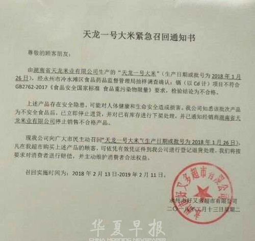 该份通知由永州市好又多超市有限公司(以下简称好又多超市)发布,发布日期为2018年2月13日,并加盖了好又多超市的公章。好又多超市在该通知中称,天龙米业生产的“天龙一号大米”(生产日期或批号为2018年1月26日)经永州市冷水滩区食品药品监督管理局抽样调查确认,镐项目(一种银白色的高熔点金属)不符合《食品安全国家标准》中的食品重污染物限量要求,检验结论为不合格。