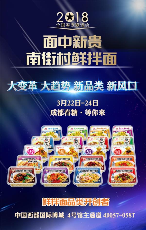 2018年3月22日到24日,第98届全国糖酒商品交易会将在“天府之城”成都隆重举办。作为鲜拌面品类开创者,南街村鲜拌面将携新品亮相本次盛会。据了解,本次新品上市将会在原有基础上进一步增加创新型新口味,从口味,品质,生产工艺等全方位升级,进一步满足更多消费者真实饮食需求。