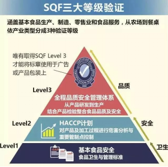 被称之为全球食品行业安全与质量体系钻石级标准的SQF(safety quality food),是全球食品安全倡议组织(GFSI)认可的国际标准,融合了HACCP 和ISO9000这两套体系,对食品链中每个环节都需要进行认证。而SQF的三大等级验证基本涵盖了食品生产、加工制造、零售和服务等检验内容,以确保食品从农场到餐桌每一处细节都有保障。