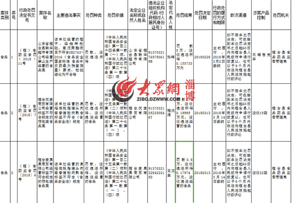 3月15日,桓台县食品药品监督管理局发布行政处罚信息公示,公布了一批涉及食品的案件信息。其中,山东省桓台县联华超市有限公司、桓台优麦商贸有限公司、桓台麦果果商贸有限公司被通报。