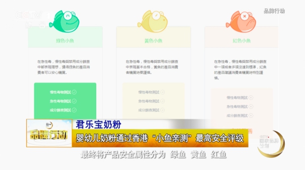 据央视报道,日前香港第三方检测机构“水中银”发布婴幼儿奶粉抽检报告,采用鱼胚胎生物测试技术“小鱼亲测”对香港市场销售的16款奶粉进行检测,君乐宝奶粉通过,安全评级,证明国产奶粉的质量安全已经达到国际,水平。