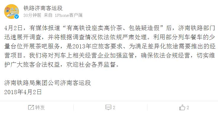济南铁路局集团公司济南客运段官方微博4月2日发布消息,回应有媒体报道“有高铁设座卖高价茶、包装疑造假”一事。济南客运段表示已迅速展开调查,并将根据调查情况依法依规严肃处理。此外,将对列车上相关经营企业加强监管,确保依法合规经营,切实维护广大旅客合法权益,欢迎社会各界监督。