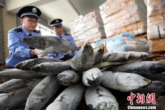2018年3月27日,广州海关破获“727”走私冻三文鱼案,图为涉案走私冻三文鱼。