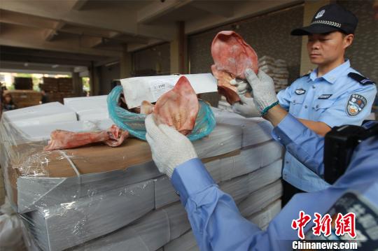 2018年3月26日,广州海关查获千吨走私冻品案,图为涉案走私冻猪耳朵。