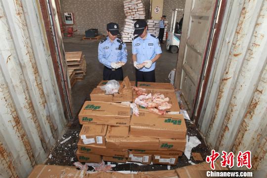 2018年3月26日,广州海关查获千吨走私冻品案,图为缉私警察检查涉案冻品。