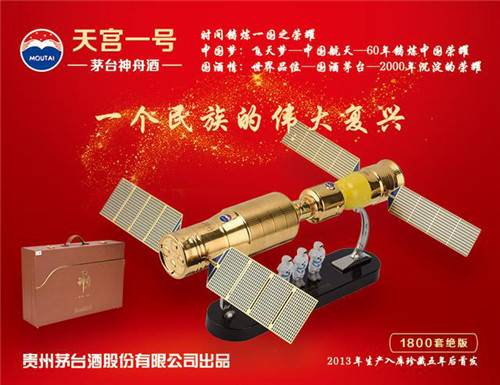 享誉世界的国酒茅台具有2000年的历史积淀,而天宫一号与神舟十号则代表着中国绵延60年的飞天梦,“天宫一号”特制纪念酒正是贵州茅台酒股份有限公司特别推出,用飘香的美酒为航天英雄庆功助威,承担作为国酒的企业责任,为祖国的航天事业做出贡献,通过茅台神舟酒(天宫一号特制纪念酒)表达对中国航天事业的自豪,对日益繁荣昌盛的祖国的热爱与祝福。