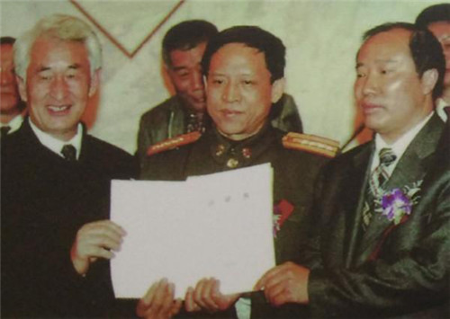茅台集团董事长袁仁国与时任总工程师季克良手捧茅台神舟酒三大原料遨游太空证书