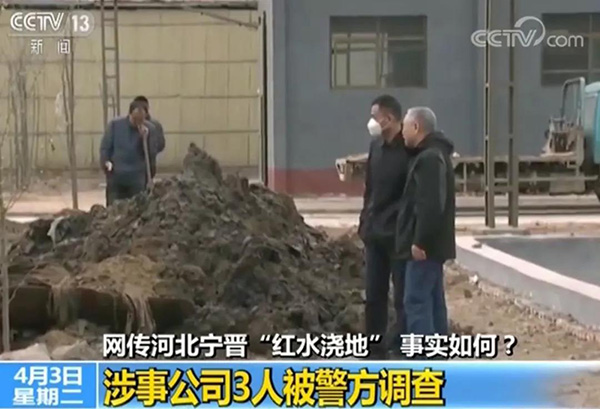 记者了解到,这段“红水”灌溉农田的视频3月29日出现在网络上后,河北环保部门人员当天就和警方一起前往邢台市宁晋县调查。3月31日,环保部门勒令涉嫌排污的企业,河北昊汇科技有限公司停产,并由警方将这家公司3名犯罪嫌疑人带走调查。随后,当地成立了由环保、公安、安监、水务等部门组成的联合调查组,进入企业排查、寻找污染源。
