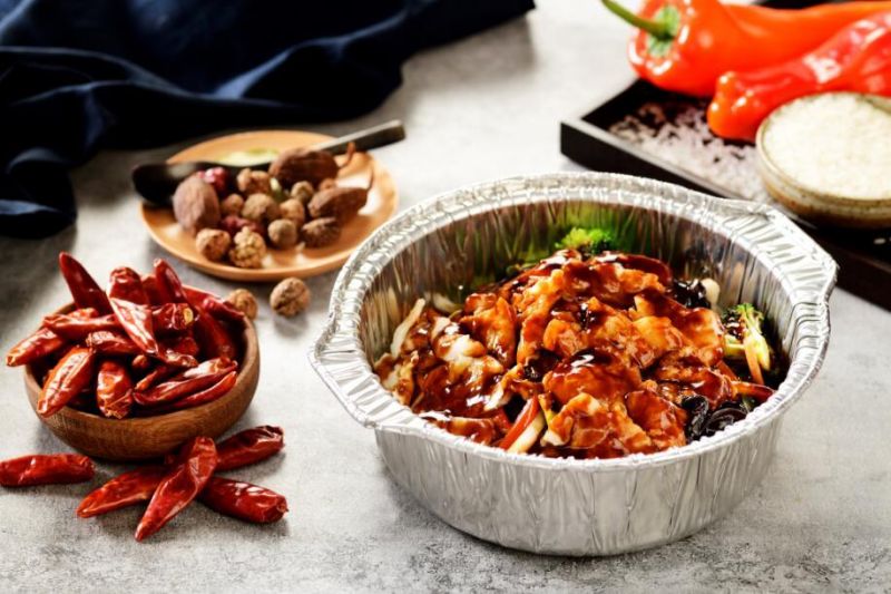 一个直径18厘米的铝箔锅,将牛肉、鸡肉、鱼片等任一种主料,以及蔬菜类、根茎类、菌菇类配菜放置其中,再搭配米饭或特制面条,佐以秘制的口味酱汁之后,将所有食材一起进行焖制,三分钟之后,呈现到你面前的会是色香味俱全、令人食指大动的一“锅”美味。