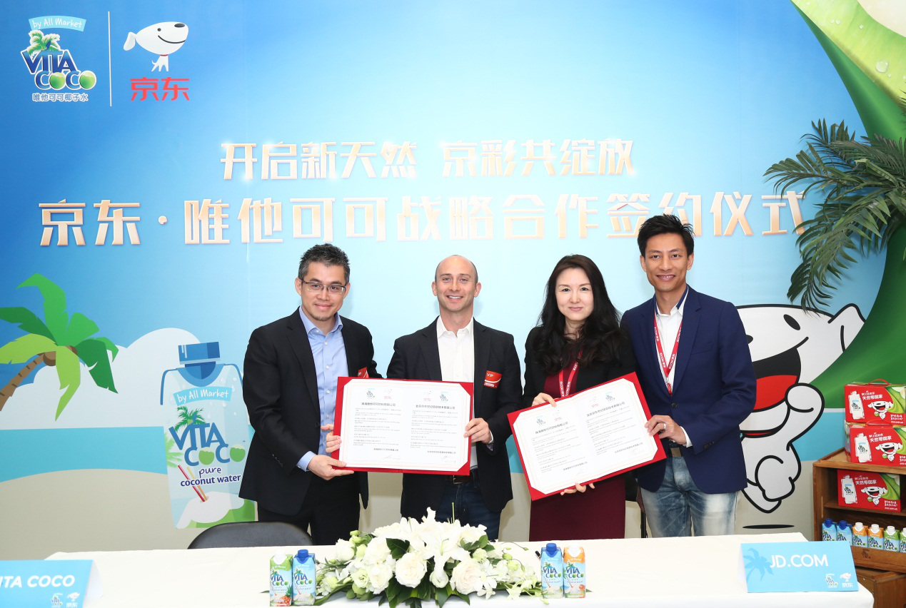 4月2日,全球最知名的天然椰子水品牌——唯他可可与中国线上线下第一超市——京东超市,在京东大厦签订战略合作协议,唯他可可与京东正式成为战略合作伙伴;唯他可可创始人及全球CEO Michael Kirban与京东集团副总裁、京东商城消费品事业部总裁冯轶出席了本次会议并共同签订了双方的战略合作协议,双方就天然健康消费趋势以及精准“无界零售”未来合作达成了高度共识。