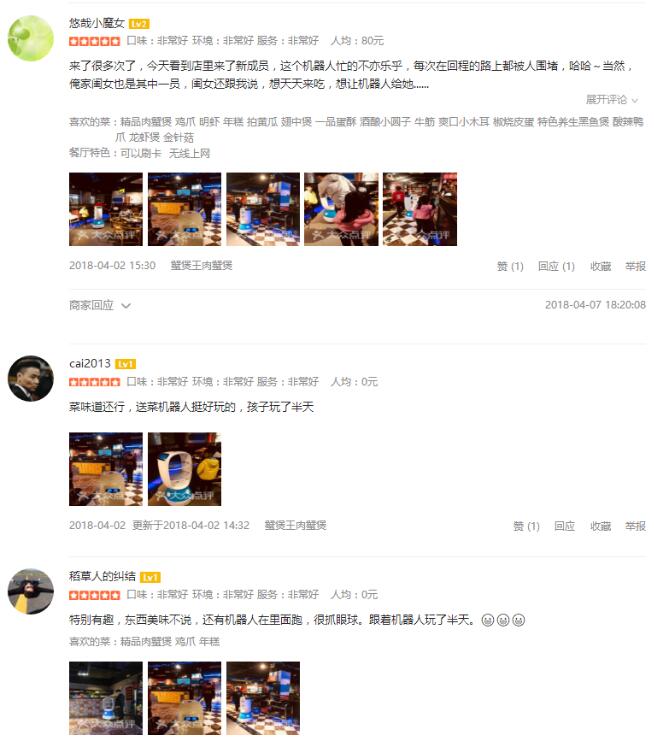 以蟹煲王万嘉商业广场店为例,从2018年3月15日到4月15日,一共获得了39个顾客评价,含有“机器人”关键字的11条(22%),平均得分4.98,远高于不含“机器人”关键字的4.72。自从引入花生传菜机器人后,在大众点评上的好评带来不少客源。
