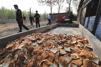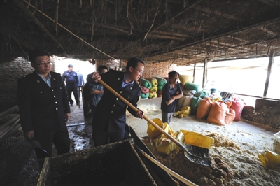 昨日,通州区北堤寺村,执法人员用铁锹翻找用豆渣遮掩的泔水。本版摄影/新京报记者 王飞
