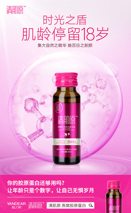 据讲解,燕之典清肌原燕窝胶原蛋白肽饮品,是从人体胶原蛋白流失,直接引起变老的痛点出发研发,集合大自然之美肤精华,精选深海鲣鱼、雨生红球藻、西印度樱桃等为原料,每瓶含5000mg胶原蛋白肽,含量十分高;分子量小于2000道尔顿,易被人体接受,在皮肤中构成一张细密的弹力网,如支架般支撑着皮肤,保持角质层水分以及纤维结构完整;特别添加的雨生红球藻,具有非常明确的抗氧化作用,能够清除体内自由基,防止胶原蛋白被氧化。28天一个周期,每个周期3盒,坚持3个月疗程,让你看得见年轻。