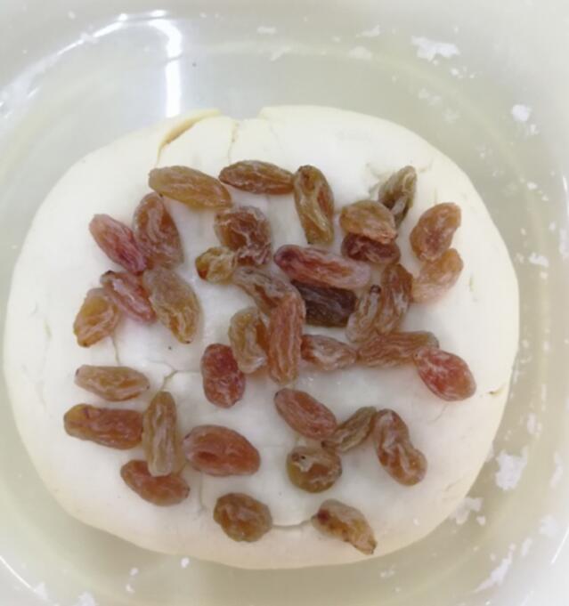 4.将面团放进湿润纱布,包住,置温暖处发酵。当发成两倍大小加入葡萄干。