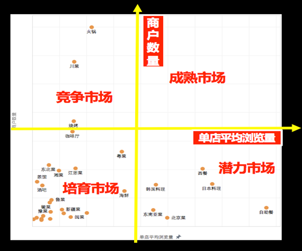 按照呼和浩特商户数量、单店平均浏览量两个维度分析,本地潜力市场集中在西餐、韩国料理、东南亚菜、北京菜、日本料理、自助餐等业态,而火锅、川菜、烧烤等市场已成红海。
