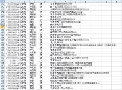 还不到15分钟,陈京宏就通过QQ给记者发来一份Excel表格,内有5000条信息。和截图内容一样,这份表格包括姓名、电话、性别和地址,但没有订餐日期。包括朝阳、密云等区在内,北京16个区的数据都有涉及。