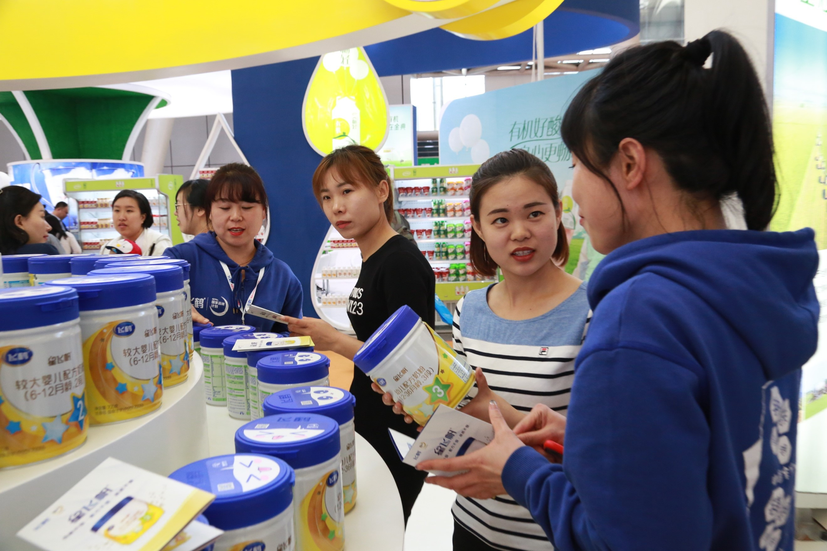 2018中国国际奶业展览会飞鹤乳业展厅前消费者正倾听导购讲解