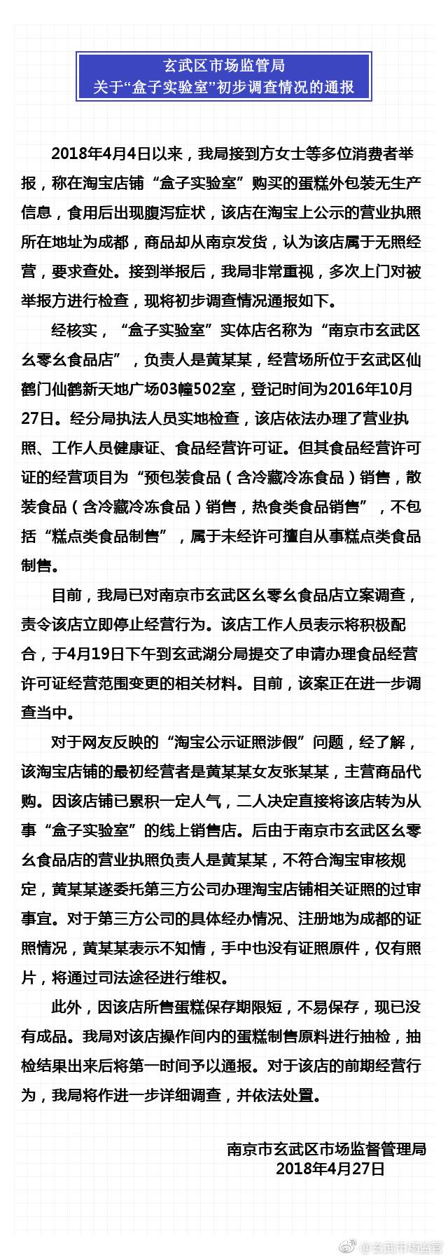 由于盒子实验室的售卖的蛋糕保质期短,在封店之后已经没有成品。玄武区市场监督管理局对该店操作间内的蛋糕制售原料进行抽检,抽检结果出来后将进行通报。目前,对于该店的前期经营行为,玄武区市场监督管理局将进一步详细调查,并依法处置。