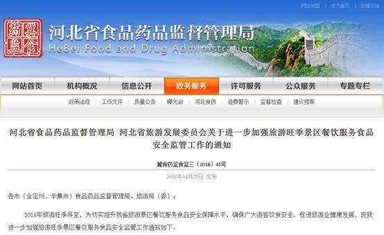 近日,河北省食药监局、省旅游委联合印发《关于进一步加强旅游旺季景区餐饮服务食品安全监管工作的通知》,根据河北旅游景区实际,督促旅游景区经营者和餐饮服务提供者,及时向餐饮服务食品安全监管部门报告季节性歇业和开业情况,严禁无证餐饮服务提供者进驻景区。