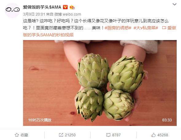 近日,微博上知名美食博主发布视频,做了一道长相奇特操作繁杂的蔬菜——洋蓟,引来了一波洋蓟忠实粉丝的热捧,纷纷转发评论并晒出自己在家实操洋蓟的图片或视频。