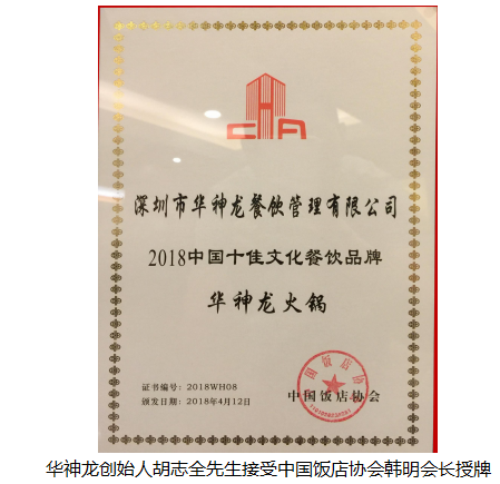 2018年4月12日,由中国饭店协会主办的“新餐饮、新势力、新品牌、新未来”第四届中国特色餐饮品牌创新大会暨第二届中国餐饮企业家领袖峰会在广州成功举办。峰会网罗了来自全国各地一众优秀餐饮品牌,并推出了2018中国特色餐饮品牌榜。其中,来自深圳的老字号川味火锅品牌——华神龙荣膺“2018中国十佳文化餐饮品牌”大奖项,这也是广东省内唯一一家入选榜单的品牌企业。