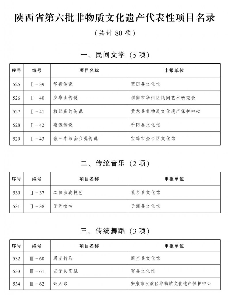 核心提示: 按照《陕西省非物质文化遗产代表作申报评定暂行办法》,经申报、评审、公示等程序,陕西省日前批准将华胥传说等9大类80个项