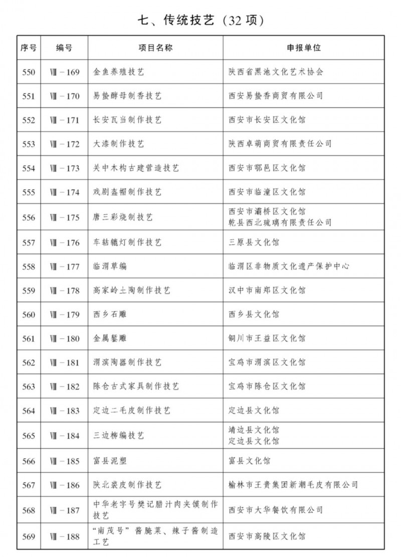 按照《陕西省非物质文化遗产代表作申报评定暂行办法》,经申报、评审、公示等程序,陕西省日前批准将“华胥传说”等9大类80个项目列入陕西省第六批非物质文化遗产名录。榆林市子洲唢呐、定边二毛皮制作技艺、三边柳编技艺、陕北裘皮制作技艺、横山区炖羊肉制作技艺、神木火判官、白草寺庙会共7项入选。