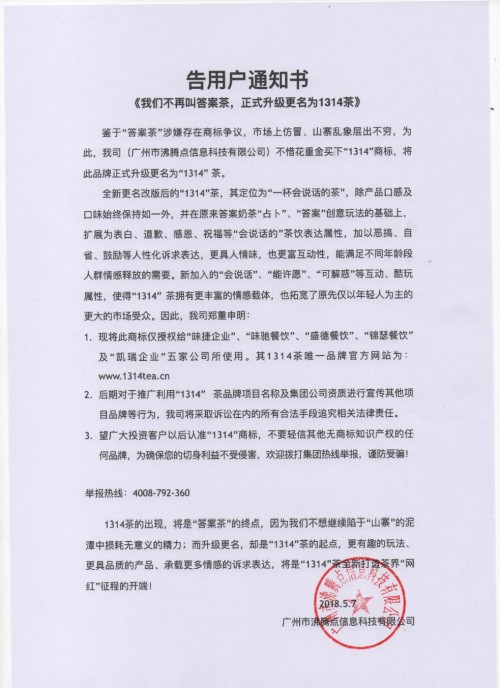 一是“答案茶”本身具有商标争议,且其爆红已经掀起了一场山寨模仿风。然而,陷入商标之争的1314茶公司却无法拿起法律武器对已经开始混乱的市场进行有效调整,这也是网上呼声最高的一个解释;二是1314茶公司的战略发展调整需求,做品牌升级也好,出于对品牌长线发展的考虑也罢,更名只是其中的一部分。其中,值得一提的是,传“1314茶”已得到A轮资本注入。这意味着,如今,有创意、有人气、又有钱的1314茶将更有信心去做大幅度的品牌升级与战略调整,以便接下来面向市场更精准、更有力地发力!