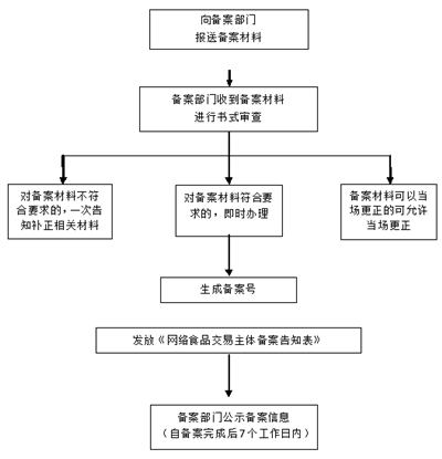 食品药品监管部门收到备案材料后,备案材料符合要求的,当场备案;不符合要求的,应当一次告知备案人补正相关材料。备案部门制作网络食品交易主体备案告知表,注明备案号。