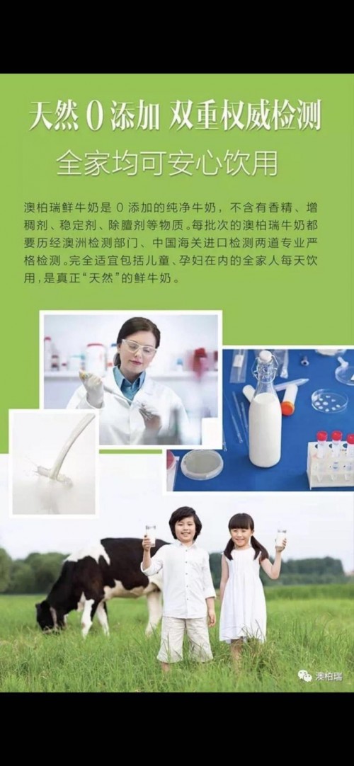 Ausberry澳柏瑞鲜牛奶是具有双重权威检测的百分百0添加纯净牛奶,它不含有香精、增稠剂、除膳剂等物质。每批次空运来华的澳柏瑞鲜奶,都会历经澳洲检测部门、中国海关进口检测部门这两道专业严格的检测机构,只为保障鲜奶的高品质。是儿童、孕妇都能品尝的“天然好奶”!