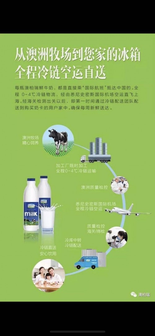 每瓶澳柏瑞鲜牛奶经由悉尼史密斯国际机场空运直飞上海,全程0~4℃冷链,实时温度监控,确保每周新鲜送达,1周内即可将鲜牛奶从澳洲牧场送达您的餐桌,敬请安心饮用!