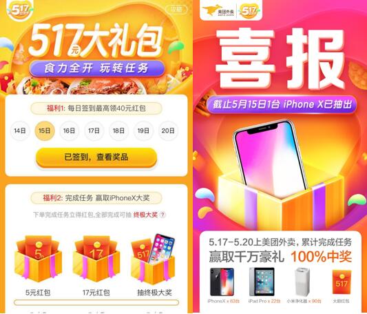 同时,吃货节的活动置了多重任务奖励。用户完成早餐订单、下午茶订单、夜宵订单、鲜花蛋糕订单、美团超市订单、生鲜果蔬订单、到店自取订单、跑腿代购订单等8项任务的任意一个,即可在活动页面领取下单任务奖,品类红包一张。累计完成3项任务还能领取5元红包,完成5项任务立得17元红包,全部完成8项任务,就可以抽取终极大奖iphoneX。