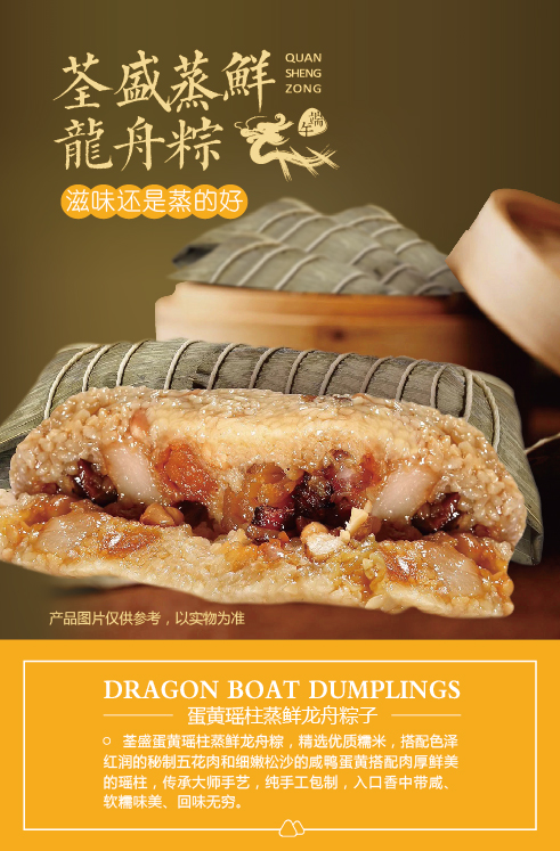 蒸鲜龙舟粽是荃盛食品在2018年首发的端午节传统美食新品,采用最新技术蒸熟,以及最新用料配方,使其成为一个全新的粽子品类。一直奉行“以客惟尊,品质至竖”的荃盛食品再次不负众望,该产品初次投入市场,便迎来了各界人士的阵阵好评,其口感软糯,香中带咸,浓郁的粽叶香与馅料彼此交融,令人回味无穷。据参与新品测评的体验者介绍,吃惯了水煮的粽子,此次荃盛食品采用最新技术制作的蒸粽子让大家有了一种全新的体验,蒸鲜龙舟粽的味道更加纯正浓厚,香味紧锁,用料丰富,是一道真正色香味俱全的端午鲜粽。