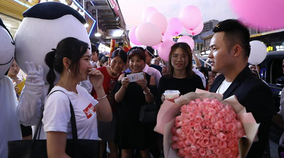 就在人们纷纷观望的时候,一位小伙子手捧鲜花从车上下来,小伙子的朋友也拿着气球相继下车,一起走向女孩。对此,“围观群众”似乎有着一种默契,自动为小伙子与女孩让开了一定的空间,只有1314茶的两个人偶“默默地”陪在女孩身边!