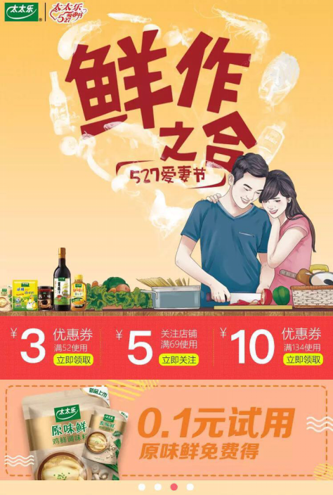 为迎接527爱妻节的到来,太太乐开启了专属的电商平台优惠,以实际行动鼓励男生走进厨房,用鲜味用爱心为最爱的她下厨,表达爱与感谢。