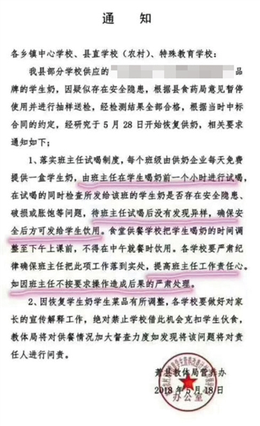 这则后经萧县教体局证实的通知称,萧县部分学校供应的两种品牌的学生奶,因疑似存在安全隐患,根据县食药局意见暂停使用并进行抽样送检,经检测结果全部合格,经研究于5月28日恢复供奶。