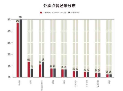 数据显示,来自于住宅区的外卖点餐交易额占比达到50%。而外卖的消费场景也在从住宅、大学校园、写字楼等拓展到酒店、商铺、医疗单位、娱乐场所等,多元化趋势明显。来自于酒店的订单量占比已经高达8%。随着用户外卖习惯的养成,异地差旅人士成为外卖不容忽视的重要人群。